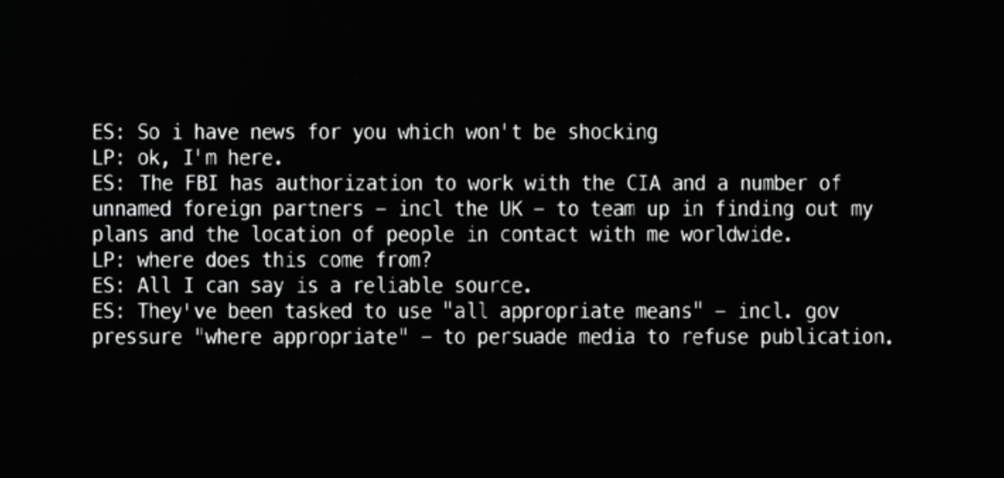Τέλος, περιγράφονται οι δύσκολες συνθήκες επικοινωνίας Poitras και Greenwald με τον Snowden, μετά τη διαρροή των αποκαλύψεων.