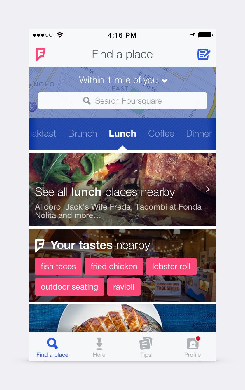 Παρέα με το νέο λογότυπο έχουμε και την πρώτη εικόνα από το νέο Foursquare, η οποία μας δείχνει την αρχική σελίδα της εφαρμογής. Δεν υπάρχει κάπου check in επιλογή, καθώς είπαμε πως η εφαρμογή εστιάζει καθαρά στην εξερεύνηση τοποθεσιών και στις προσωπικές προτάσεις στους χρήστες.