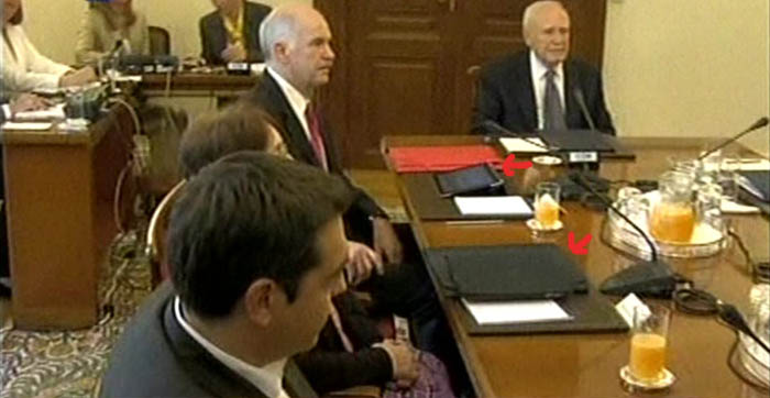 Στο περιθώριο των ειδήσεων που προέκυψαν από τη σημερινή συνάντηση των πολιτικών αρχηγών βρήκαμε μία που αξίζει να γίνει “πρωτοσέλιδο” σε ένα τεχνολογικό site σαν το δικό μας. Ναι, κυρίες και κύριοι, αφήστε για λίγο στην άκρη την εθνική κρίση και πριν προετοιμαστείτε για τις σημερινές ώρες “αγανάκτισης” στο Σύνταγμα, ρίξτε το βλέμμα σε κάτι λιγάκι πιο ανάλαφρο. Eίναι γεγονός, ο πρωθυπουργός μας Γιώργος Α. Παπανδρέου και η γενική γραμματέας του ΚΚΕ Αλέκα Παπαρήγα έδωσαν το παρόν στη συνάντηση μαζί με τα… iPad τους! Το γεγονός επιβεβαιώνει η ακόλουθη φωτό, που δείχνει το iPad του πρωθυπουργού ανοικτό πάνω στο τραπέζι (με το smart cover να το στηρίζει), ενώ αυτό της κ. Παπαρήγα κλειστό με ένα μαύρο κάλυμμα.