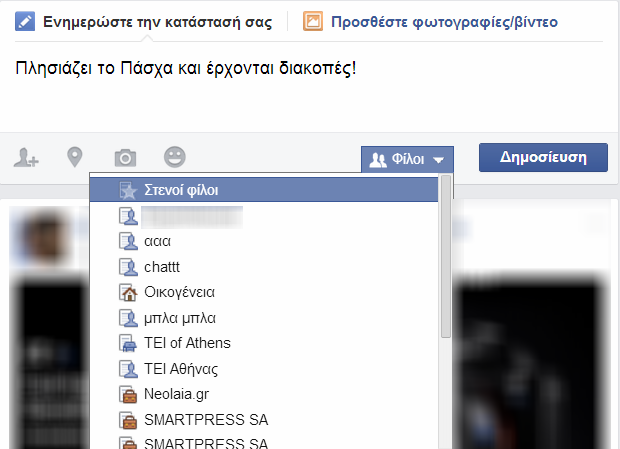 Κάθε φορά που δημιουργείτε μια δημοσίευση, το κοινό ίσως είναι ρυθμισμένο στην επιλογή «Φίλοι» ή «Δημόσια». Πατώντας την επιλογή, θα δείτε στο τέλος των διάφορων επιλογών κάποιες από τις λίστες σας και την επιλογή «Δείτε όλες τις λίστες…» σε περίπτωση που έχετε δημιουργήσει αρκετές. Επιλέξτε αυτή που θέλετε και το μήνυμα σας θα φτάσει μονάχα στους χρήστες τους οποίους έχετε προσθέσει στη λίστα.