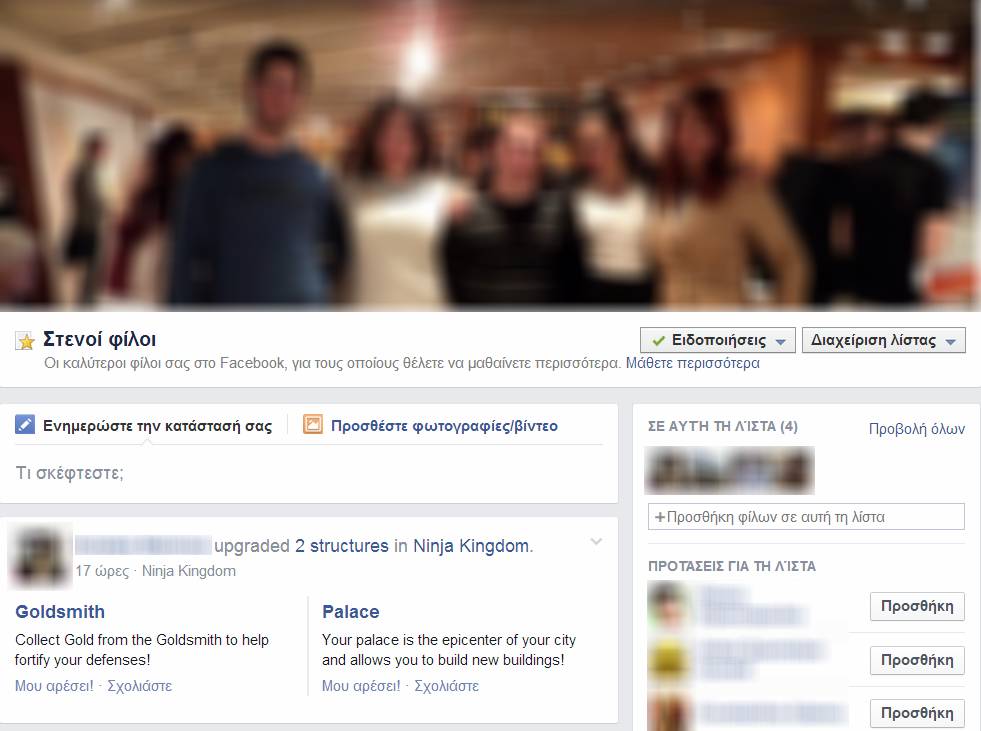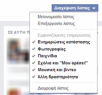 Δε χρειάζεται να λέτε τα πάντα σε όλους, καθώς κατά πάσα πιθανότητα οι φίλοι σας χωρίζονται σε κατηγορίες (οικογένεια, συνάδελφοι, σχολή κλπ) και πολλές φορές δεν υπάρχει εκείνο το περιεχόμενο το οποίο ενδιαφέρει όλες τις κατηγορίες «φίλων» σας. Με τις λίστες μπορείτε εύκολα να ομαδοποιείτε τις δημοσιεύσεις σας.