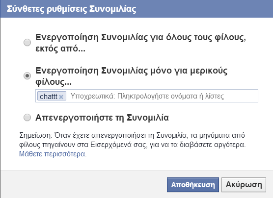 Αν, για παράδειγμα, είστε στη δουλειά κάθε πρωί και θέλετε να είστε online μονάχα στους συναδέλφους σας ώστε να μη σας ενοχλούν οι άλλοι «φίλοι» σας, τότε μπορείτε να δημιουργήσετε μία λίστα με την ονομασία «Συνάδελφοι» ή ό,τι άλλο όνομα θέλετε και να τη θέσετε στο chat πατώντας το εικονίδιο με το γρανάζι κάτω δεξιά στην οθόνη σας, στη συνέχεια την επιλογή «Σύνθετες ρυθμίσεις…» και τέλος, στην επιλογή «Ενεργοποίηση Συνομιλίας μόνο για μερικούς φίλους» να πληκτρολογήσετε και να επιλέξετε τη λίστα που δημιουργήσατε.