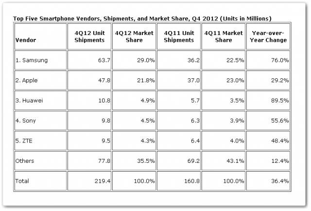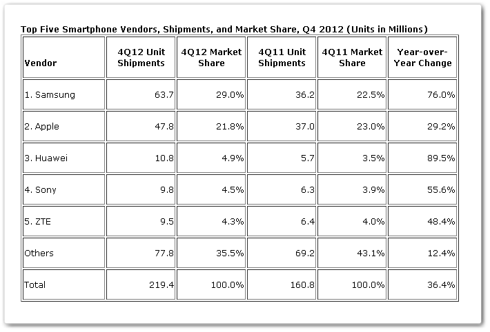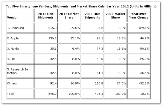 Σημειώστε πάντως πως για πρώτη φορά, στο σύνολο των συσκευών που πουλήθηκαν κατά το 4ο τρίμηνο του 2012, 45,5% ήταν smartphones, ποσοστό αδιανόητο σε προηγούμενες εποχές. Δεν είναι παράξενο λοιπόν που η Apple διέθεσε 47,8 εκατομμύρια συσκευές, σε αυτό το τρίμηνο, αριθμό μεγαλύτερο από κάθε άλλη φορά.
