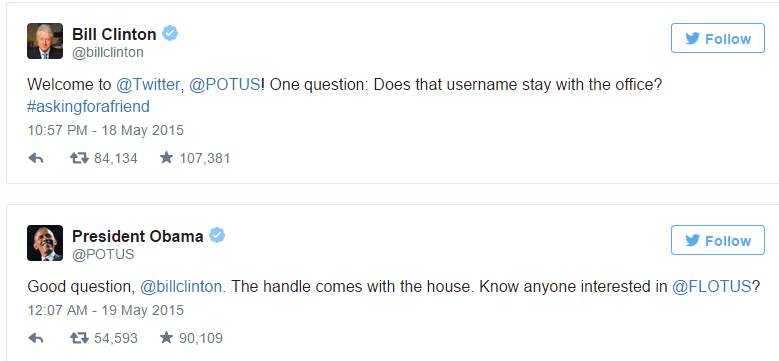 Από την πρώτη στιγμή της παρουσίας του Obama στο twitter, δεν έλειψαν τα trolls στο account του, ενώ χαρακτηριστικός ήταν ο διάλογος του με τον Bill Clinton, ο οποίος τον ρώτησε αν το username θα παραμείνει στο γραφείο όταν αφήσει αυτή τη θέση, με τον Obama να συνεχίζει το αστείο ρωτώντας αν ενδιαφέρεται κάποιος για το account @FLOTUS (αναφερόμενος φυσικά στην υποψηφιότητα της Hilary Clinton).