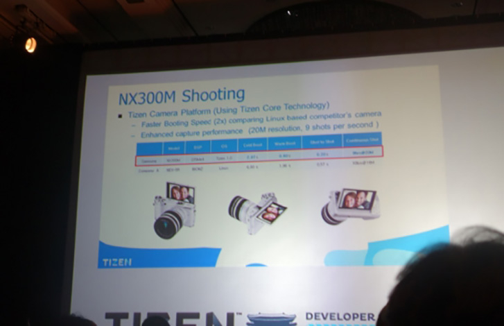 Αναφερόμαστε σε μία φωτογραφική μηχανή, με τον κωδικό NX300M, που κυκλοφόρησε στην Κορέα και είναι το πρώτο εμπορικό προϊόν της Samsung με Tizen OS. Ενσωματώνει μία ειδική έκδοση του λειτουργικού που ονομάζεται “Tizen Camera Platform”, ενώ υπόσχεται δύο φορές υψηλότερη ταχύτητα από τις Linux προτάσεις του ανταγωνισμού. Διαθέτει ανάλυση 20Mpixels και μπορεί να τραβήξει 9 shots το δευτερόλεπτο.