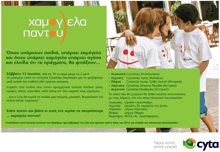 Η Cyta δίνει συνέχεια σε προηγούμενες κοινωνικές τις δράσεις σκορπώντας χαμόγελο αισιοδοξίας στην κυπριακή κοινωνία, που δοκιμάζεται έντονα αυτή την περίοδο, εξαιτίας τής οικονομικής κρίσης.
