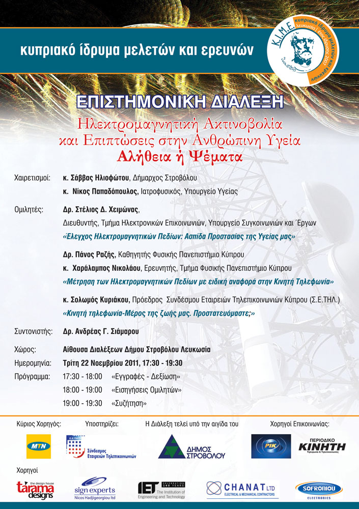 Το Κυπριακό Ίδρυμα Μελετών & Ερευνών (ΚΙΜΕ), προγραμμάτισε και θα τελέσει Επιστημονική Διάλεξη με θέμα «Ηλεκτρομαγνητική Ακτινοβολία και οι επιπτώσεις της στην Ανθρώπινη Υγεία: Αλήθεια ή Ψέματα»