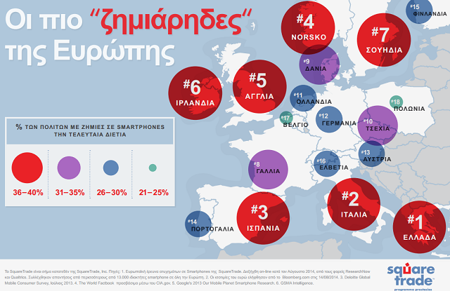 [Δ.Τ] Η Square Trade, ηγέτιδα στην παροχή συμβολαίων προστασίας ηλεκτρονικών συσκευών, με περισσότερους από 10 εκατομμύρια πελάτες διεθνώς, ανακοίνωσε σήμερα τα στοιχεία έρευνας, που καταδεικνύει ότι την τελευταία διετία οι κάτοικοι των χωρών του μεσογειακού Νότου -με προεξάρχοντες τους Έλληνες- αναγκάστηκαν να αντικαταστήσουν ή να επισκευάσουν τα κατεστραμμένα τους smartphones, σε ποσοστό περίπου 40% των κατόχων!