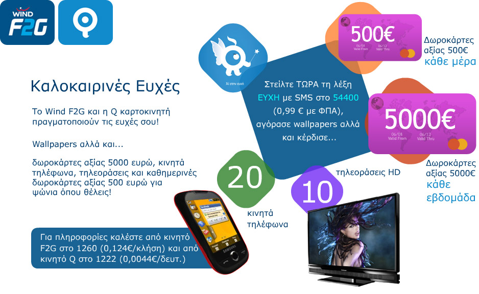 Πραγματικότητα μπορούν να γίνουν οι ευχές των συνδρομητών καρτοκινητής WIND F2G και Q αλλά και όλων των συνδρομητών καρτοκινητής της WIND, συμμετέχοντας στο διαγωνισμό «Καλοκαιρινές Ευχές» και κερδίζοντας πλούσια δώρα. Στο διαγωνισμό που θα διαρκέσει μέχρι και τις 3 Σεπτεμβρίου 2010, οι συνδρομητές με κάθε μήνυμα στο 54400 συμμετέχουν στο Διαγωνισμό αγοράζοντας ένα wallpaper το οποίο θα μπορούν να κατεβάζουν στο κινητό τους από την ιστοσελίδα http://summerwishes.wind.com.gr ενώ, παράλληλα, συγκεντρώνουν συμμετοχές, διεκδικώντας δώρα αξίας έως και 5.000€/εβδομάδα σε δωροκάρτες. Για τη συμμετοχή στο διαγωνισμό, αρκεί η αποστολή SMS με τη λέξη ΕΥΧΗ στον αριθμό 54400. Κάθε μήνυμα στο 54400 έχει χρέωση 0,99€ με ΦΠΑ και αντιστοιχεί στην αγορά ενός wallpaper καθώς και σε 20 συμμετοχές.