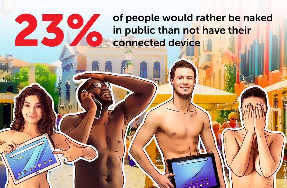 Επιπλέον, οι άνθρωποι είναι έτοιμοι να βρεθούν σε αμήχανη θέση ή ακόμη και να προκαλέσουν προσωπική βλάβη για να παραμείνουν συνδεδεμένοι. Για παράδειγμα, το 26% κοιτάζει την οθόνη του κινητού όταν διασχίζει τον δρόμο και το 21% ενώ περπατούσε σε μια άγνωστη/επικίνδυνη περιοχή. Επιπλέον, ένας στους πέντε δήλωσε ότι αισθάνεται γυμνός χωρίς τη συνδεδεμένη συσκευή του. Αυτό είναι κάτι που η Kaspersky Lab διερεύνησε περαιτέρω σε ένα πρόσφατο πείραμα, όπου ένας αβοήθητος και γυμνός εθελοντής είχε την εντολή να προσπαθήσει να εντοπίσει τα ρούχα του σε μια άγνωστη πόλη χωρίς τηλέφωνο και όλα τα πλεονεκτήματα που αυτό του προσφέρει. Όπως έδειξε η έρευνά μας και αυτό το κοινωνικό πείραμα, η αίσθηση του να είσαι χωρίς μια συνδεδεμένη συσκευή προσομοιάζει με αυτή του να είσαι γυμνός.