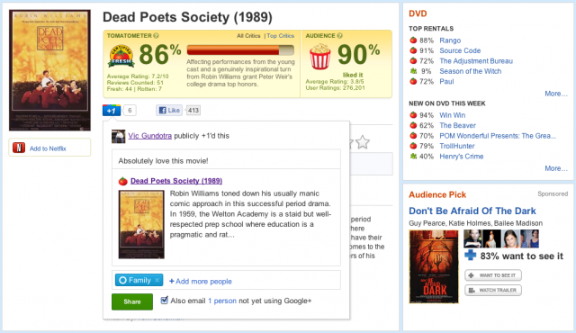 Ήταν καιρός η Google να πραγματοποιήσει την υπόσχεσή της: Την δυνατότητα να μοιραζόμαστε το περιεχόμενο που μας αρέσει από τα διάφορα sites που επισκεπτόμαστε, στο stream μας στο Google+. Μέχρι τώρα, κάθε φορά που πατούσατε το +1 σε κάποιο δημοσίευμα, συμβάλατε ώστε το δημοσίευμα αυτό να ανεβαίνει ψηλά στις αναζητήσεις των χρηστών, ή ακόμα και να εμφανίζεται πιο πολύ στις αναζητήσεις των φίλων σας. Ήταν δηλαδή σαν να το “προτείνατε” στους υπόλοιπους χρήστες και η πρότασή σας αυτή, εμφανιζόταν στα αποτελέσματα αναζήτησης.