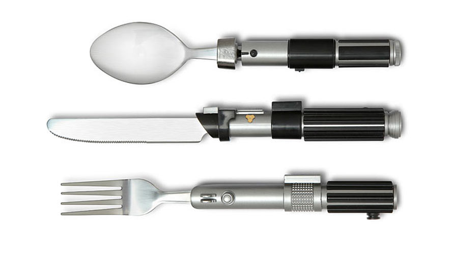 Κι αν δεν μπορείς να φας με ξυλάκια; Ο φαν ο σωστός, ο πορωμένος, προσέχει και τα μαχαιροπήρουνά του. Ένα σετ των τριών (πιρούνι Luke, κουτάλι Yoda και μαχαίρι Darth Vader) για κάθε Star Wars fan, που, εδώ που τα λέμε, αν του το κάνουνε δώρο μπορεί και να σκεφτεί και να αγοράσει κανονική εξάδα.