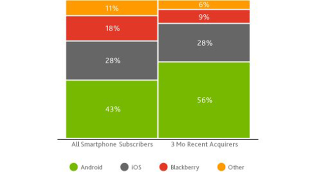 Το Android συνεχίζει να ηγείται στην αγορά των mobile λειτουργικών συστημάτων, σύμφωνα με μία πρόσφατη έρευνα της Nielsen. Τα γενικά μερίδια αγοράς αποδίδουν το 43% στο Android, το 28% στο iOS, το 18% στο Blackberry, ενώ το υπόλοιπο 11% ανήκει στα άλλα λειτουργικά. Η ίδια έρευνα δείχνει ότι το τελευταίο τρίμηνο, το 56% των πωληθέντων συσκευών, ήταν εξοπλισμένες με το Android, το 28% με iOS, το 9% με Blackberry και το 6% με τα λοιπά λειτουργικά συστήματα. Τον Αύγουστο, τα smartphones αποτελούσαν το 58% των πωληθέντων κινητών, δίνοντας ώθηση κατά 43% στη διείσδυση των smartphones.