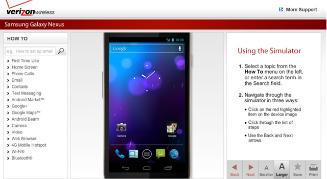 Το Samsung Galaxy Nexus είναι αυτή τη στιγμή το αστέρι του Android, καθώς είναι το πρώτο κινητό που κυκλοφόρησε εξ αρχής με τη νέα έκδοση Ice Cream Sandwich. Το αμερικάνικο δίκτυο Verizon δημοσίευσε στη σελίδα του έναν εξομοιωτή που σας μαθαίνει όλες τις βασικές λειτουργίες της συσκευής, όχι με γενικευμένο κείμενο και εικόνες σε μορφή εγχειριδίου, αλλά μέσω ενός εικονικού Galaxy Nexus. Να διευκρινίσουμε εδώ, πως όταν λέμε εξομοιωτής, εννοούμε ένα interactive tutorial, και όχι έναν Android emulator. Στην αριστερή στήλη της σελίδας υπάρχουν οι κατηγορίες και υποκατηγορίες από όπου μπορείτε να επιλέξετε τη λειτουργία για την οποία έχετε απορίες. Στη δεξιά στήλη υπάρχουν τα βήματα με τις οδηγίες που πρέπει να ακολουθήσετε ώστε να ολοκληρώσετε την επιθυμητή λειτουργία. Στη μέση βρίσκεται το virtual κινητό όπου απεικονίζονται με animation οι κινήσεις που πρέπει να κάνετε, όπως ακριβώς θα φαίνονται και στην πραγματική συσκευή. Το εικονικό κινητό της σελίδας είναι interactive, ώστε όχι μόνο να βλέπετε, αλλά και να πατάτε εκεί που πρέπει, για να κατανοείτε καλύτερα την κάθε διαδικασία.