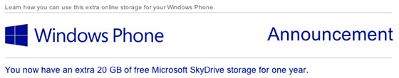 Το “πνεύμα” των Χριστουγέννων καταλαμβάνει τη Microsoft, καθώς η αμερικανική εταιρεία, ενόψει των εορτών, αποφάσισε να προσφέρει στους κατόχους Windows Phone ένα “bonus” 20GB στην cloud storage service που διαθέτει, το SkyDrive. Το δωράκι θα είναι ενεργό για τον επόμενο χρόνο στους χρήστες των συσκευών της αμερικανικής εταιρείας και, αν είστε κάτοχοι Windows Phone, μπορείτε να το ενεργοποιήσετε έως τα τέλη Ιανουαρίου.