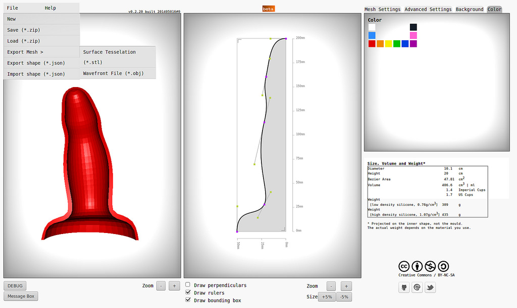 Το “Dildo Generator”, όπως πολύ… περιγραφικά ονομάζεται το project, σας επιτρέπει να κάνετε τις προσωπικές σας σχεδιαστικές παρεμβάσεις σε ένα “φαλλικό μοντέλο”, να αποθηκεύσετε τη δημιουργία σας σε ένα 3D αρχείο και, στη συνέχεια, να το.. τυπώσετε σε έναν τρισδιάστατο εκτυπωτή. Ξεκινώντας από ένα “βασικό σχέδιο”, μπορείτε να αλλάξετε το ύψος, την περίμετρο, το σχήμα ακόμη και την… κάμψη του (έως χμμμ… και 180 μοίρες) και, φυσικά, να επιλέξετε το χρώμα της προτίμησής σας, το οποίο κι αυτό παίζει το… ρόλο του σε τέτοιου τύπου υλοποιήσεις.