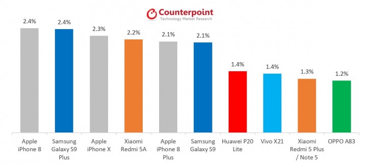 Στη δεύτερη θέση βρίσκεται το Samsung Galaxy S9+ ενώ στη δεκάδα βρίσκονται συσκευές από έξι συνολικά κατασκευαστές.