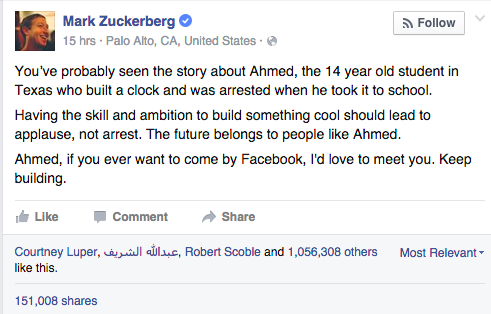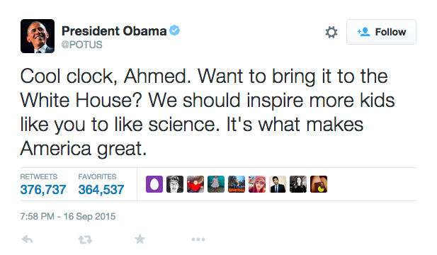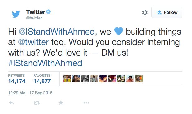 Ήδη, πάντως, ο μικρός, πέρα από δημοσιότητα, έχει κερδίσει το ενδιαφέρον φορέων, οργανισμών και εταιρειών, όπως ο ίδιος ο Λευκός Οίκος, το Facebook, το Twitter, αλλά και η Google. Ο Mark Zuckerberg αφιέρωσε ένα μήνυμα για τον Ahmed προσκαλώντας τον να επισκεφτεί το Facebook, το Twitter του προσέφερε ένα internship, ο Obama τον προσκάλεσε να φέρει το ρολόι στο Λευκό Οίκο, ενώ ενδιαφέρον έδειξε μεταξύ άλλων η υποψήφια για το χρίσμα των Δημοκρατικών Hillary Clinton, η Google, όπως και η NASA.
