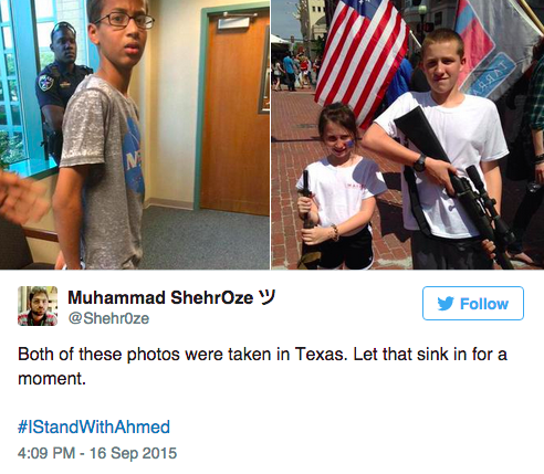 Η παραπάνω εικόνα δείχνει σε ένα και μόνο tweet την υποκρισία μίας κοινωνίας που θέλει να λέγεται δημοκρατική και κατά των διακρίσεων, βάζει ωστόσο χειροπέδες στο νεαρό Ahmed Mohamed καθώς είναι μουσουλμάνος, ενώ αντίθετα δεν αντιδρά όταν παιδιά εμφανίζονται με όπλα σε festival του Texas.