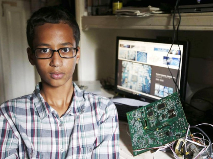 Ένα 14χρονο αγόρι στις ΗΠΑ, ο Ahmed Mohamed, είναι το νέο πρόσωπο της επικαιρότητας, χάρη σε μία “παρεξήγηση” που φέρνει στην επιφάνεια ζητήματα όπως η ισλαμοφοβία αλλά και η υποκρισία που υπάρχουν έντονα σε κοινωνίες όπως αυτή των ΗΠΑ, όσο και αν κρύβονται καλά από τις δηλώσεις των πολιτικών αλλά και από τις ίδιες τις κοινωνίες. Έχοντας ζωηρό ενδιαφέρον για τη μηχανική αλλά και την καινοτομία, ο Ahmed κατασκεύασε -μέσα σε 20 μόλις λεπτά όπως σημειώνει- ένα ρολόι, το οποίο αποτελείται από μία ψηφιακή οθόνη και ένα ηλεκτρικό κύκλωμα.