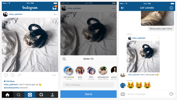 Οι χρήστες πλέον μπορούν να μοιράζονται φωτογραφίες και βίντεο από το feed τους μέσω της υπηρεσία Direct όπου, όταν ο χρήστης λάβει το μήνυμα και πατήσει επάνω στην εικόνα, οδηγείται κατευθείαν στην αρχική ανάρτηση. Η δυνατότητα αυτή θα γίνεται επιλέγοντας το νέο βελάκι που εμφανίζεται κάτω από κάθε εικόνα, δίπλα στο comment. Μπορείτε επίσης να μοιραστείτε hashtag και location σελίδες, από το νέο εικονίδιο.