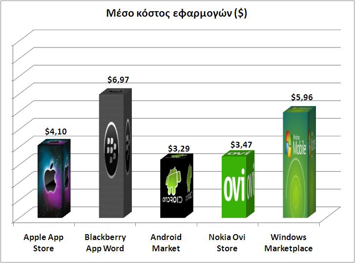 Φτηνότερες οι Android εφαρμογές, σύμφωνα με έρευνα της Distimo που διεξήχθη στις Η.Π.Α. σε χρονικό διάστημα από τον Ιανουάριο έως τον Ιούλιο του 2010. Ο μέσος όρος του κόστους των αφαρμογών που διατίθενται επί πληρωμή στο Android Market είναι μόνο 3,29 $ (περίπου 2,6 €). Ακολουθεί το Ovi με 3,47$ και αμέσως μετά οι εφαρμογές του Apple Store με 4,10$ (περίπου 3,6 €). Μάλλον υπερεκτιμημένες είναι οι εφαρμογές στο Windows Market place και ακόμη περισσότερο στο Blacberry App World.