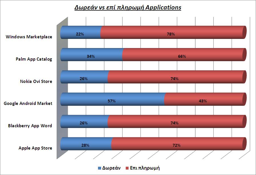 Στην ίδια έρευνα της Distimo καταδεικνύεται το γεγονός ότι οι περισσότερες από τις μισές εφαρμογές του Android Market (57% για την ακρίβεια) διατίθενται δωρεάν. Μάλιστα η διαφορά με τα άλλα Application Stores είναι σχεδόν διπλάσια αφού το μερίδιο των δωρεάν εφαρμογών στα υπόλοιπα Application Stores κυμαίνεται μεταξύ 22 και 34%.