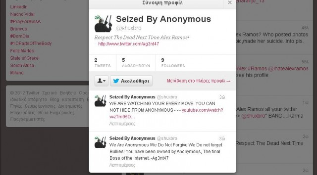Την Παρασκευή, στο twitter, ένας έφηβος με όνομα χρήστη Alex Ramos διέρρευσε εικόνες (που ισχυρίστηκε ότι ήταν) από την αυτοψία της 15χρονης Amanda, συνοδεύοντας την εικόνα του νεκρού της κορμιού με ηλίθια σχόλια. Οι Anonymous ανέλαβαν υπηρεσία. Παραβίασαν τον λογαριασμό του και δημοσίευσαν τα στοιχεία του εδώ. Γιατί; «Γιατί δημοσίευσε μία εικόνα νεκρής κοπέλας λέγοντας ότι είναι η Amanda Todd και γιατί είναι μ…..»