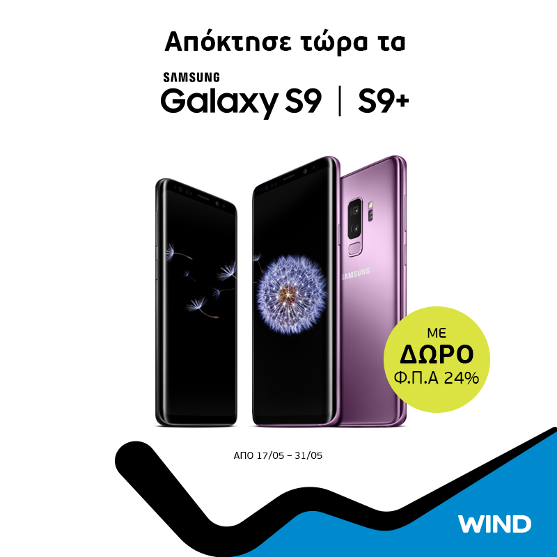 Tα κορυφαία smartphone Samsung Galaxy S9 και Galaxy S9+ προσφέρει τώρα η WIND σε ακόμα χαμηλότερη τιμή, αποκλειστικά μέσα από τα καταστήματα της αλυσίδας της σε όλη την Ελλάδα.