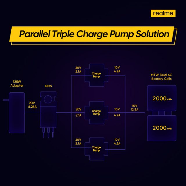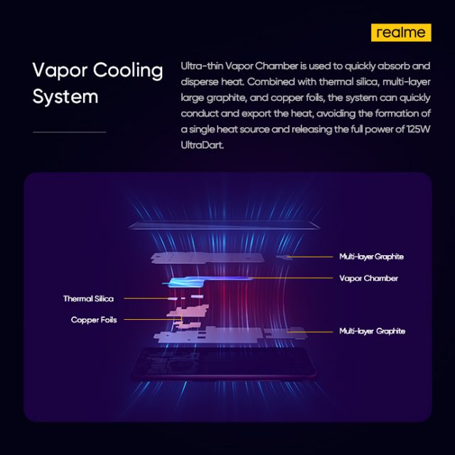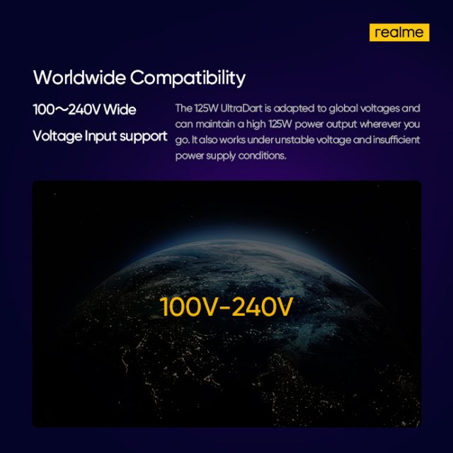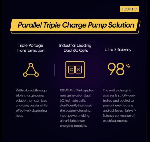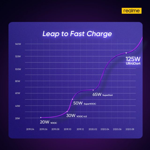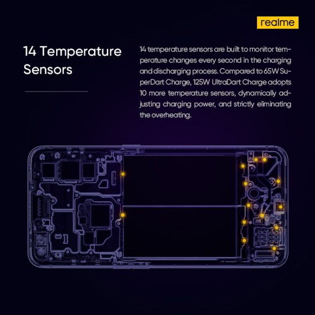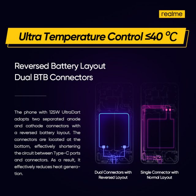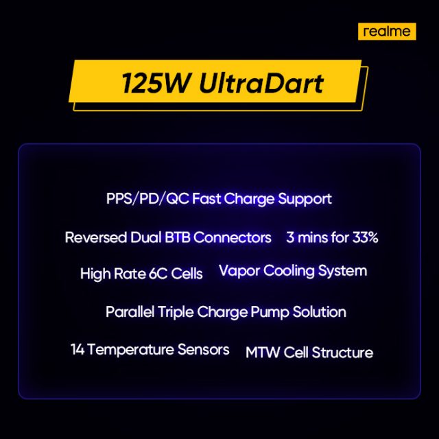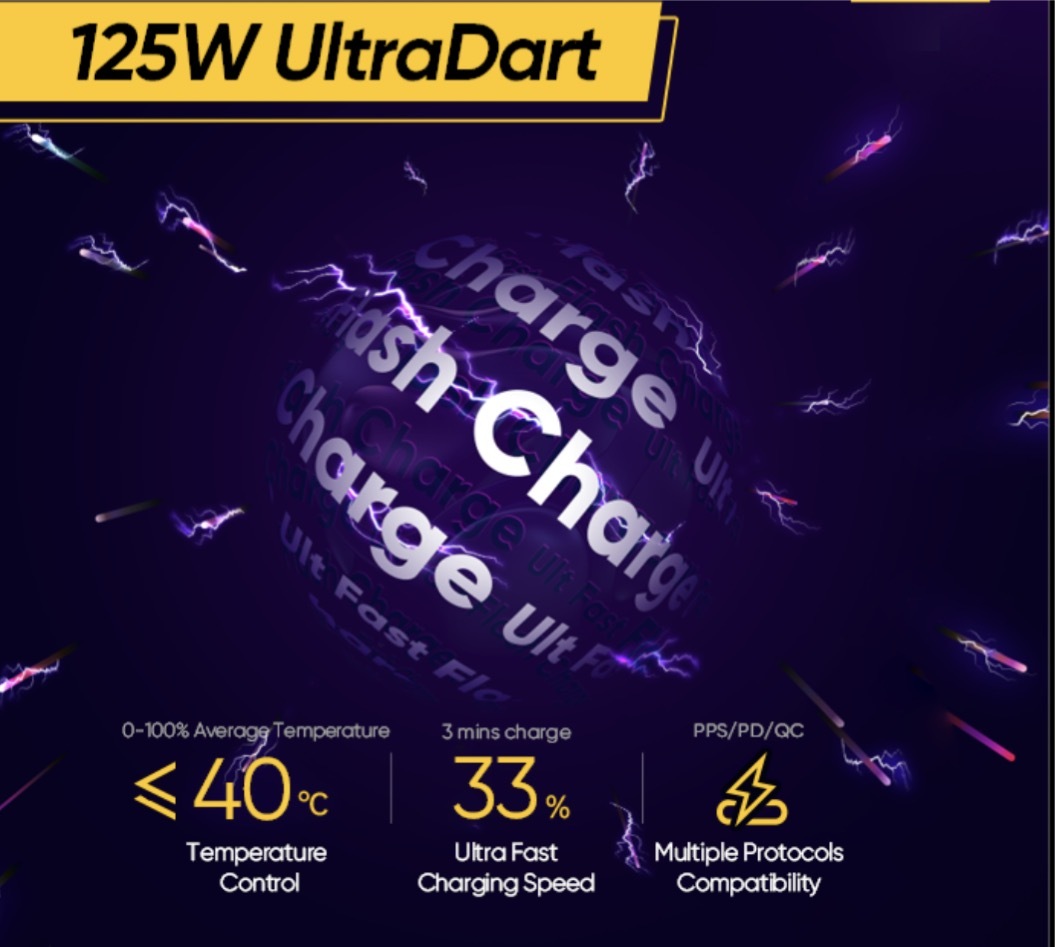 Με την 125W UltraDART τεχνολογία, ένα 5G smartphone με μέγεθος μπαταρίας 4000mAh μπορεί να φορτιστεί περίπου 33% σε 3 λεπτά, υποστηρίζοντας την καθημερινή, απαιτητική χρήση ενός 5G smartphone. Ο λόγος για τον οποίο μπορεί να φορτιστεί πλήρως σε μόλις 20 λεπτά με ασφάλεια είναι ο έλεγχος της θερμοκρασίας του smartphone κάτω από 40 °. Η realme θέλει να ελέγχει την ταχύτητα φόρτισης έξυπνα και με ασφάλεια, αντί να ακολουθεί την μέγιστη ταχύτητα φόρτισης. Με τον έλεγχο θερμοκρασίας, μπορεί να χρειαστεί μέχρι και 13 λεπτά για 100% φόρτιση.