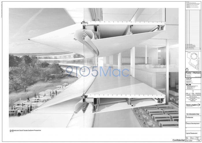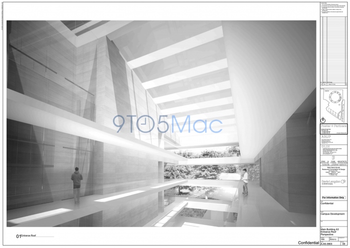 Ηλιακοί συλλέκτες καλύπτουν το σύνολο της οροφής του κυρίως κτιρίου, ενώ οι παραπάνω εικόνες που μόλις δόθηκαν στη δημοσιότητα απεικονίζουν πρόσθετες εσωτερικές και εξωτερικές πτυχές της νέας δομής. Οι νέες εικόνες που αποκαλύπτει το 9to5Mac προέρχονται από διαφάνειες γραφείων που εργάζονται για το project.