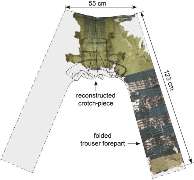 Το “αρχαιότερο παντελόνι στον κόσμο” ήταν κατασκευασμένο από μαλλί, αποτελούνταν από τρία ξεχωριστά κομμάτια, δύο για τα πόδια και ένα που κάλυπτε τον καβάλο, διέθετε πλαϊνά σκισίματα στη μέση, ενώ έκλεινε στις δύο πλευρές με κορδόνια περίσφιξης…