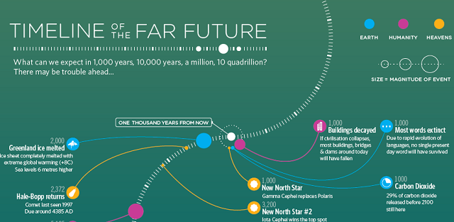 Ένα infographic, που μπορεί να τραβήξει το ενδιαφέρον σας για ώρα τόσο με το μέγεθός του όσο και με το περιεχόμενό του, πραγματοποιεί προβλέψεις για πολλά (μα πάρα πολλά) χρόνια μετά. Τι περιμένουμε σε 1.000 χρόνια; Σε 10.000; Σε 1.000.000 έτη από σήμερα; Χμμμ…