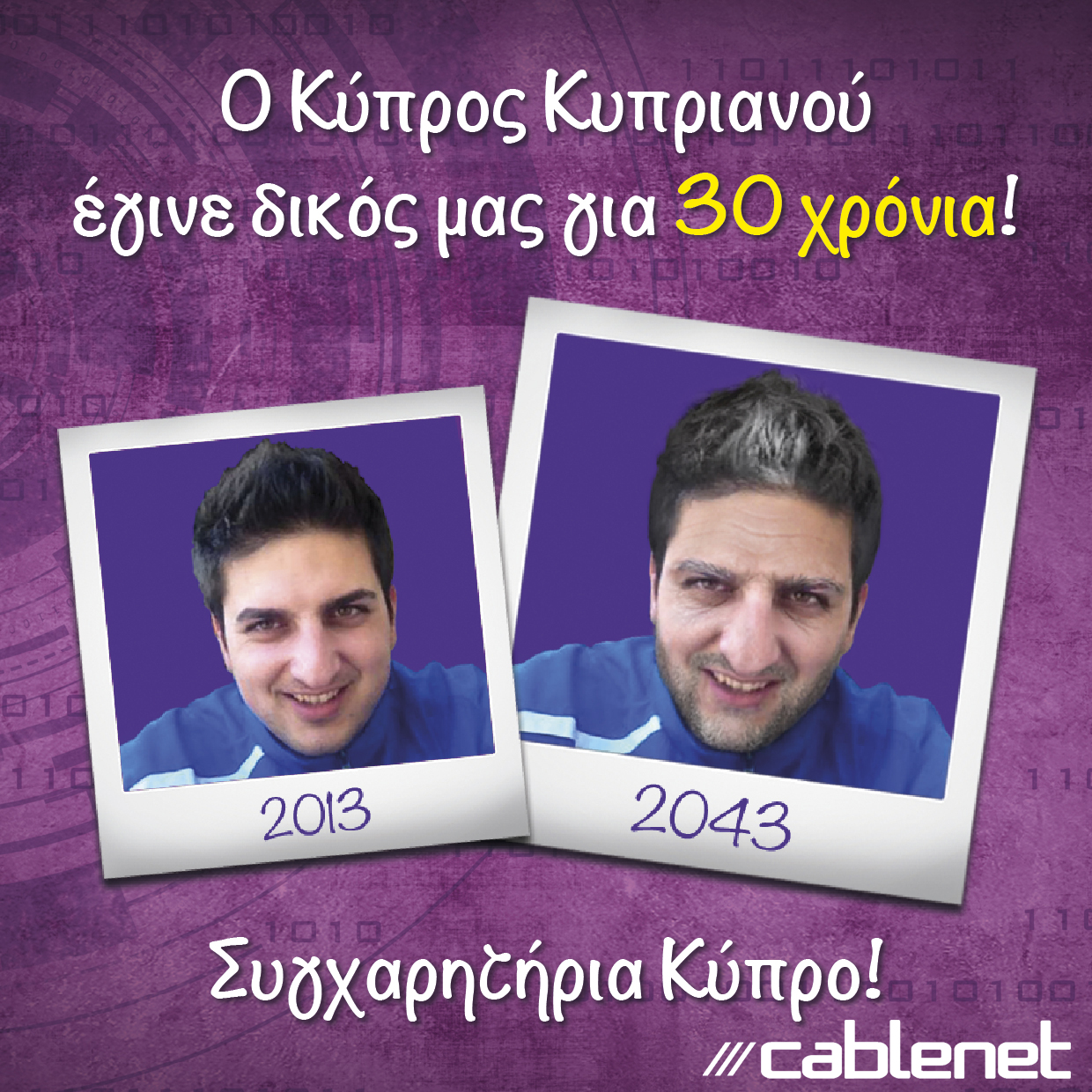 Ο Κύπρος Κυπριανού θα σερφάρει στο Ίντερνετ και θα απολαμβάνει τηλεοπτικό περιεχόμενο εντελώς δωρεάν για 30 χρόνια. Το μόνο που χρειάστηκε να κάνει ο τυχερός ήταν ένα “Like” στη σελίδα της Cablenet και να ανεβάσει μία φωτογραφία του για να δει πως θα μοιάζει το 2043.