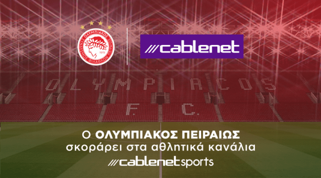 H Cablenet ήρθε σε συμφωνία με την ΠΑΕ Ολυμπιακός Πειραιώς εξασφαλίζοντας τους εντός έδρας αγώνες των «ερυθρόλευκων» για το ελληνικό πρωτάθλημα της Super League, ώστε να μπορούν οι πολυάριθμοι φίλοι της ομάδας στην Κύπρο, να απολαμβάνουν την ομάδα τους.