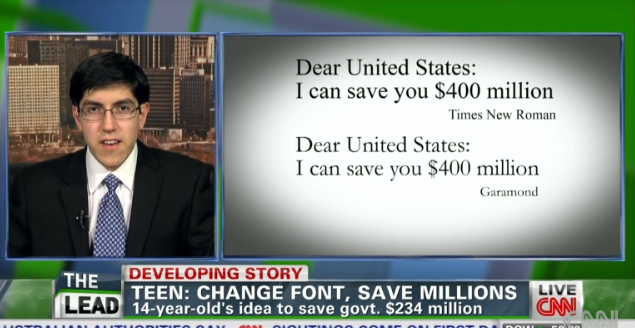 Μελετώντας τρόπους για τη μείωση της χρήσης χαρτιού και μελανιού στο σχολείο του, ένας 14χρονος έφηβος υπολόγισε ότι μία απλή… αλλαγή γραμματοσειράς (από Times New Roman σε Garamond) μπορεί να οδηγήσει οργανισμούς και επιχειρήσεις στο να εξοικονομήσουν πάρα μα πάρα πολλά χρήματα, όσον αφορά αυτά που ξοδεύουν για τα μελάνια των εκτυπωτών τους κάθε χρόνο, όπως μεταδίδει σχετικά το CNN.