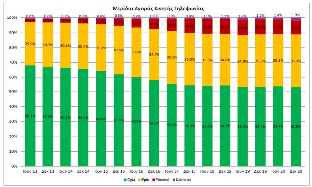 Σχεδόν αμετάβλητα παρέμειναν το 2020 τα μερίδια αγοράς των εταιριών κινητής τηλεφωνίας, με μόνη εξαίρεση την Cablenet που παρουσιάζει μικρή ανοδική τάση. Παρά τον έντονο ανταγωνισμό που αναπτύσσεται μεταξύ των τηλεπικοινωνιακών εταιρειών, οι αριθμοί δείχνουν ότι η αγορά εξακολουθεί να εστιάζεται στην διατήρηση των ήδη υπαρχόντων πελατών (κυρίως συμβολαίου) κι όχι στην εγγραφή νέων συνδρομητών.