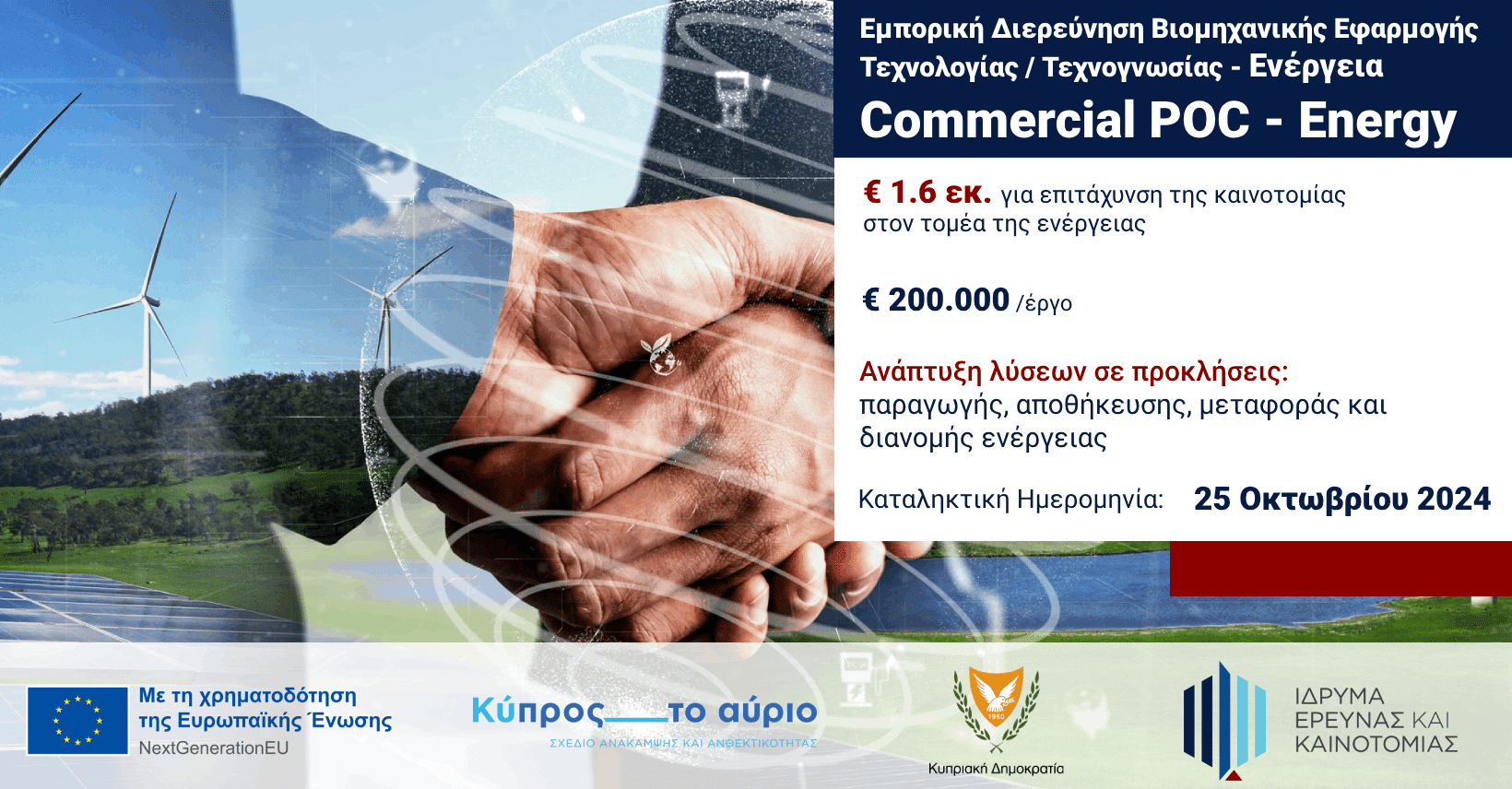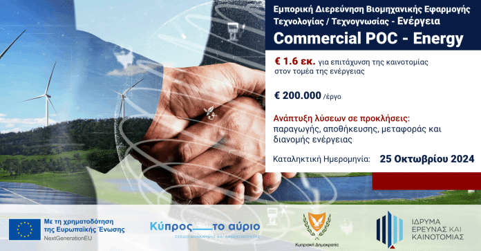 Το νέο χρηματοδοτικό πρόγραμμα «Εμπορική Διερεύνηση Βιομηχανικής Εφαρμογής Τεχνολογίας/Τεχνογνωσίας – Ενέργεια» με προϋπολογισμό €1,6 εκ. που στοχεύει στην επιτάχυνση της καινοτομίας στον τομέα της ενέργειας, ανακοίνωσε το ΙδΕΚ.