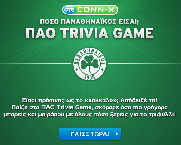 Με τι σκορ έληξε ο τελικός του Κυπέλλου Ελλάδας το 1994 που βρήκε τον ΠΑΟ νικητή και Κυπελλούχο Ελλάδας; Ποιος παίκτης του ΠΑΟ έχει κυκλοφορήσει και δίσκο; Σε ποιο στάδιο πραγματοποιήθηκε ο αγώνας του ΠΑΟ με τη Δυναμό Κιέβου για το Champions League της περιόδου 1999-2000; Αυτές και πολλές ακόμα ερωτήσεις για «δυνατούς» παίκτες, σε περιμένουν να τις απαντήσεις στην σελίδα του Conn-x στο facebook, επίσημου χορηγού της ΠΑΕ Παναθηναϊκός. To trivia game σού δίνει την ευκαιρία να επιδείξεις τις γνώσεις σου, τόσο σε χαρακτηριστικές στιγμές της ομάδας όσο και σε γνωστούς παίκτες που πέρασαν από τον Παναθηναϊκό. Κι αν νομίζεις ότι είσαι αξεπέραστος, μπορείς να προκαλέσεις σε αναμέτρηση άλλους «πράσινους» φίλους σου.