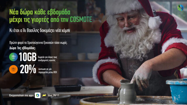 Νέα δώρα, διαφορετικά κάθε εβδομάδα, από σήμερα μέχρι τις γιορτές προσφέρει στους συνδρομητές της η COSMOTE αναλαμβάνοντας το ρόλο του Άγιου Βασίλη φέτος τα Χριστούγεννα. Η COSMOTE εγκαινιάζει την εορταστική περίοδο από τις 22 Νοεμβρίου και προσφέρει για την πρώτη εβδομάδα δωρεάν 10GB στο κινητό και 20% έκπτωση σε μία παραγγελία φαγητού ή καφέ μέσω του BOX. Οι συνδρομητές μπορούν να ενημερώνονται για τις εβδομαδιαίες προσφορές και να τις ενεργοποιούν στο My COSMOTE App και το WHAT’S UP App.