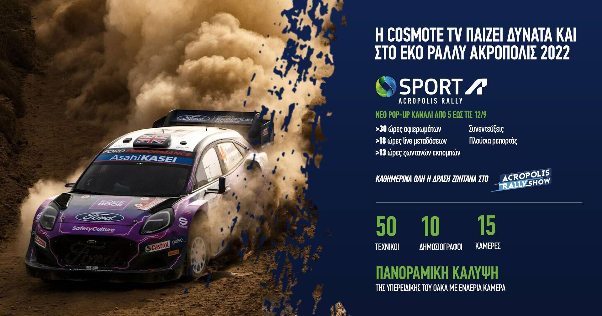 Η ώρα του EKO Ράλλυ Ακρόπολις 2022 πλησιάζει κι από τις 5 έως και τις 12 Σεπτεμβρίου το pop-up κανάλι COSMOTE SPORT ACROPOLIS RALLY θα γίνει για μια ακόμη φορά ο απόλυτος προορισμός για τους λάτρεις του «Ράλλυ των Θεών». Με περισσότερες από 30 ώρες ειδικών αφιερωμάτων, 18 ώρες live μεταδόσεων όλης της αγωνιστικής δράσης του τετραημέρου, 13 ώρες ζωντανών εκπομπών, συνεντεύξεις πρωταγωνιστών και πλούσια ρεπορτάζ, το μόνο που θα λείψει από τους τηλεθεατές της COSMOTE TV είναι το χώμα από τις ειδικές διαδρομές.