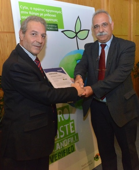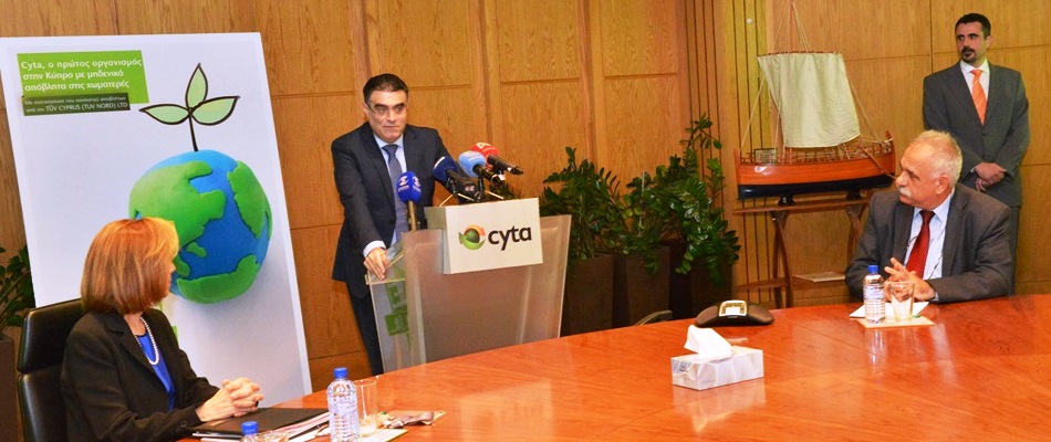 Η παράδοση του σχετικού πιστοποιητικού επαλήθευσης, έγινε χθες στη Λευκωσία (Τρίτη, 31 Ιανουαρίου) στα Κεντρικά Γραφεία της Cyta, στην παρουσία του Υπουργού Γεωργίας, Αγροτικής Ανάπτυξης και Περιβάλλοντος κ. Νίκου Κουγιάλη, μελών της κοινοβουλευτικής Επιτροπής Περιβάλλοντος της Bουλής, του Διευθυντή Τμήματος Περιβάλλοντος κ.ά.
