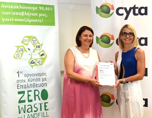 Το πιστοποιητικό «Zero Waste to Landfill» παρέδωσε στην Πρόεδρο της Cyta, κα Μαρία Τσιάκκα, η Γενική Διευθύντριά της TUV Austria Cyprus κα Σουσάννα Χαραλαμπίδου σε τελετή που πραγματοποιήθηκε την Τρίτη 25 Ιουνίου στη Λευκωσία.