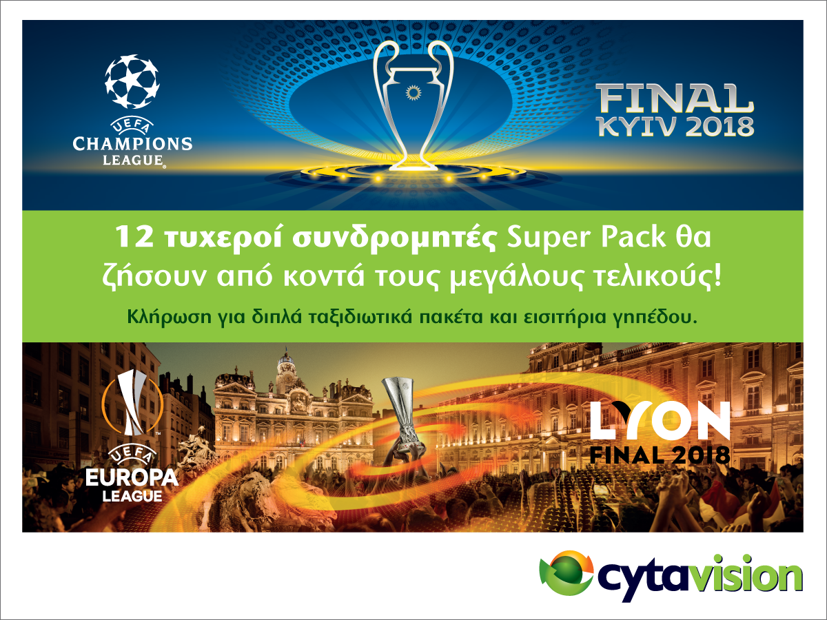 Την ευκαιρία να παρακολουθήσουν από κοντά και να ζήσουν την μαγεία των τελικών των κορυφαίων ποδοσφαιρικών διοργανώσεων UEFA Champions League και UEFA Europa Leagueτις θα έχουν 12 τυχεροί συνδρομητές της Cytavision. Η διαδικασία για την ανάδειξη των νικητών θα γίνει με ένα πολύ απλό τρόπο, σύμφωνα με τον όποιο όλοι οι πελάτες της Cyta που διαθέτουν το συνδρομητικό πακέτο Super Pack της Cytavision, χωρίς να χρειάζεται να προβούν σε οποιαδήποτε άλλη επιπρόσθετη ενεργεία, θα συμμετέχουν αυτόματα σε κλήρωση, μέσα από την οποία θα αναδειχθούν οι ακόλουθοι μεγάλοι τυχεροί: