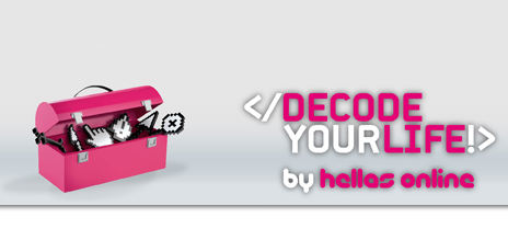 Το </DECODE YOUR LIFE!> by hellas online ξεκινά με ένα 3ήμερο δια-δραστικό εργαστήρι webmaking. Θα πραγματοποιηθεί για πρώτη φορά 1-3 Ιουλίου στις εγκαταστάσεις του ΑΙΤ και απευθύνεται σε μαθητές 3ης γυμνασίου και 1-2-3ης λυκείου χωρίς κόστος συμμετοχής. Μέσα από το πρόγραμμα οι μαθητές θα έχουν την ευκαιρία να μάθουν να δημιουργούν τα δικά τους sites και online videos, αλλά και να συνεισφέρουν το προϊόν της γνώσης τους στο έργο των οργανισμών «Δεσμός», «Μαζί για το παιδί», «Οργάνωση Γη» και «ΣΕΚΠ».