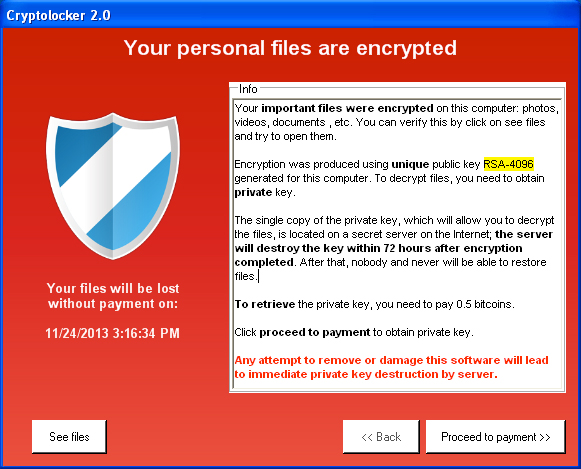 Το Cryptolocker, αφού εισχωρούσε στους υπολογιστές των θυμάτων, κρυπτογραφούσε τα αρχεία τους και έπειτα ζητούσε €400 για να τους παραδωθεί το “κλειδί” ώστε να έχουν και πάλι πρόσβαση σε αυτά, εντός 72 ωρών, ειδάλλως θα τα έχαναν για πάντα. Παρ’ότι ένα ελάχιστο ποσοστό των θυμάτων εν τέλει ενέδωσε και πλήρωσε τα λύτρα (1,3%), το κέρδος ήταν σημαντικό για τους δημιουργούς του Cryptolocker.
