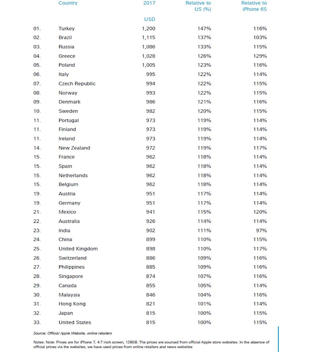 Η Deutsche Bank στην ετήσια έκθεσή της που τιτλοφορείται «Mapping the World’s Prices» περιλαμβάνει τις τιμές πώλησης του iPhone σε κάθε μία από τις 33 χώρες στις οποίες αυτό πωλείται. Η φετινή έκθεση δείχνει ότι η Βραζιλία δε βρίσκεται στην κορυφή της λίστας ως η πιο ακριβή χώρα για να αγοράσει κάποιος ένα iPhone. Αντίθετα, την πρώτη θέση καταλαμβάνει η Τουρκία, όπου η τιμή ενός iPhone είναι κατά μιάμιση φορά μεγαλύτερη σε σχέση με τις ΗΠΑ.