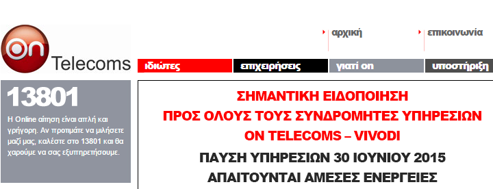 Σε ανακοίνωση που υπάρχει στη σελίδα της www.on.gr, η εταιρεία ενημερώνει τους συνδρομητές της ότι “παρά τις υπεράνθρωπες προσπάθειες που κατέβαλε το τελευταίο χρονικό διάστημα για την εξυγίανση της εν μέσω μιας ιδιαίτερα δυσχερούς οικονομικής συγκυρίας”, θα είναι σε θέση να σας παρέχει “τις υπηρεσίες τηλεφωνίας και τις λοιπές ηλεκτρονικές επικοινωνίες που απολαμβάνετε μέσω της σύνδεσής σας έως την 30.6.2015”.
