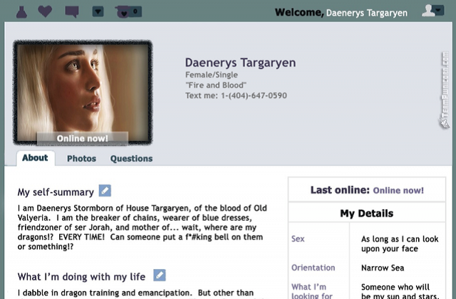 1) Αν διάφοροι ήρωες του Game of Thrones είχαν προφίλ σε dating site…