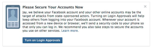 Όπως σημειώνει σε σχετικό note ο επικεφαλής ασφαλείας του site, Alex Stamos, πλέον θα υπάρχει μία ειδική ειδοποίηση σε χρήστες για τους οποίους το Facebook πιστεύει ότι ο λογαριασμός τους έχει “στοχευθεί” ή παραβιαστεί από κάποιον ύποπτο εισβολέα που σχετίζεται με κάποια κυβέρνηση.